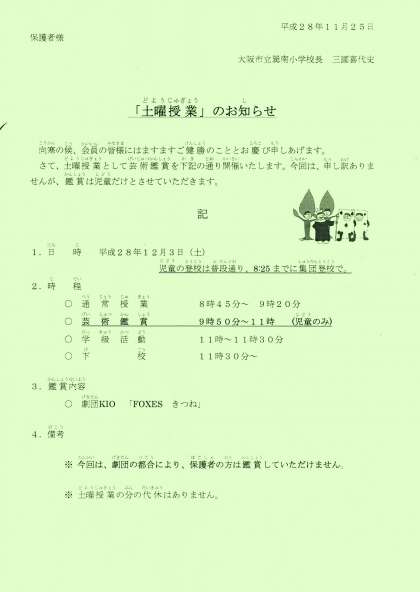 再度、明日12/2(土)の土曜授業(芸術鑑賞)のお知らせをいたします。朝は集団登校できます。普通授業がありますのでランドセルで登校してください。