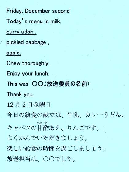 12/2毎週金曜日、給食の時間に英語で献立を紹介します。まず放送委員会の児童が英語で・・・そのあと、英語のカーン先生が同じ献立を英語で紹介します。1年生〜6年生の教室でもテレビを通じて、英語の献立に関心をもって聞いています。