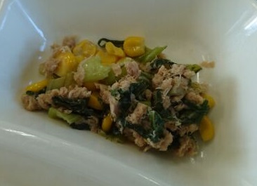 ゆでたチンゲンサイとコーン、ツナのいためものです。塩、こしょう、こい口しょゆで味つけしています。