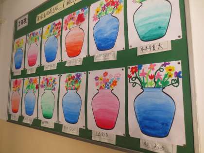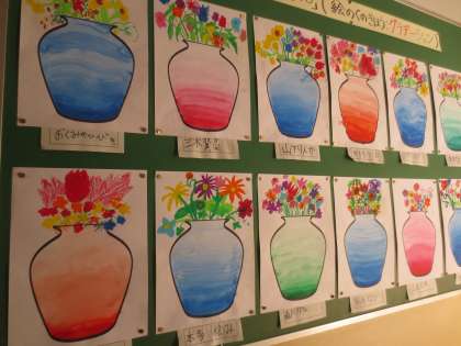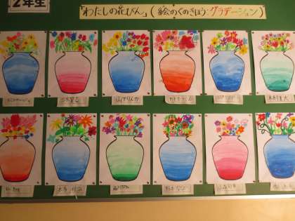 2階に2年生の図画が掲示されています。「わたしの花びん」をグラデーションの技法をつかい、ていねいに描かれています。学級にも鮮やかな「わたしの花びん」がたくさん掲示されています。