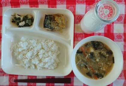 さばのみぞれかけ、みそ汁、おおさかしろなの煮びたし、ご飯、牛乳