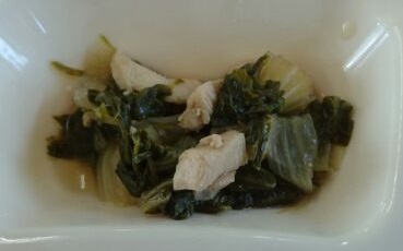 おおさかしろなの煮びたしは、塩ゆでしたおおさかしろなと鶏肉をだしで煮ます。