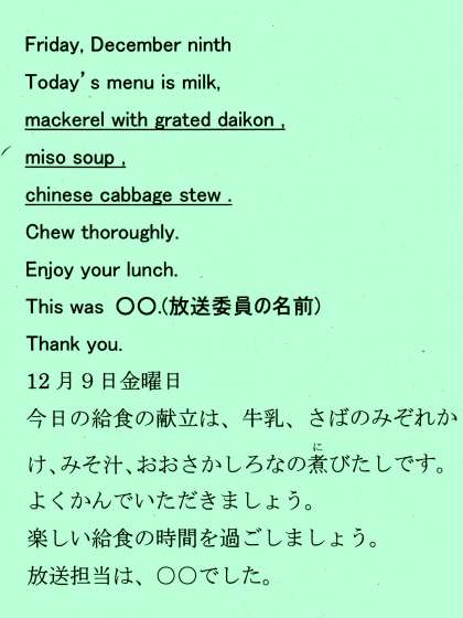 毎週金曜日、給食の時間に英語で献立を紹介します。まず放送委員会の児童が英語で・・・そのあと、英語のカーン先生が同じ献立を英語で紹介します。これから低学年も少しずつ英語に関心をもってもらうため、英語の歌やゲームを紹介していきます。