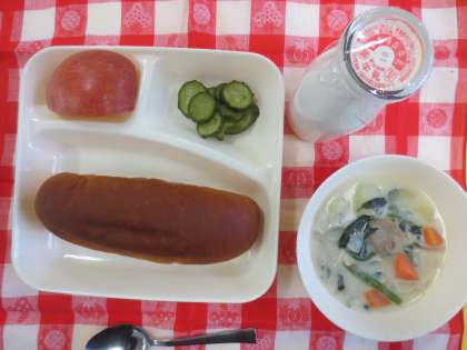 ほたて貝のクリームシチュー、きゅうりのピクルス、りんご、黒糖パン、牛乳
