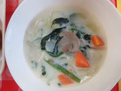 鶏肉とほたて貝を主材に小麦粉、バター、サラダ油でルーを作ったシチューです。冬野菜のほうれん草が色あざやかです。
