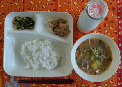 鶏肉の甘辛焼き、さつまいものみそ汁、きくなとはくさいのごまあえ、ご飯、牛乳