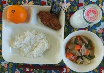 まぐろのフライ、豚肉とだいこんの煮もの、みかん、ご飯、牛乳
