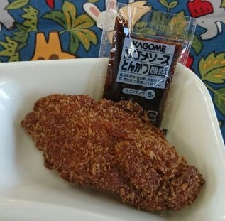 1切れもののまぐろに小麦粉、パン粉で衣をつけ油で揚げます。トンカツソースをつけて食べます。