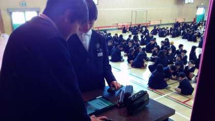 あらかじめ先生たちの声をタブレットPCに録音し、