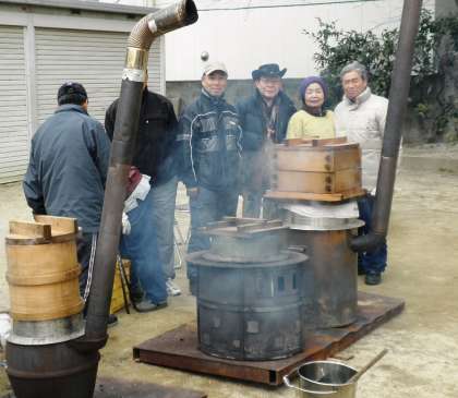 薪とせいろでもち米を蒸し、うすと杵でもちをつく。