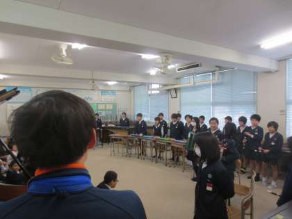 演奏後、代表児童が担任の新田先生にありがとうのメッセージを伝えていました。