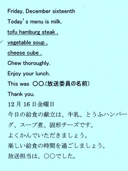12/16毎週金曜日、給食の時間に英語で献立を紹介します。まず放送委員会の児童が英語で・・・そのあと、英語のカーン先生が同じ献立を英語で紹介します。これから低学年も少しずつ英語に関心をもってもらうため、英語の歌やゲームを紹介していきます。