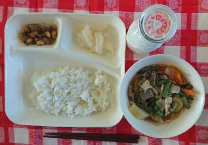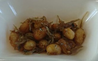油であげた大豆とちりめんじゃこを甘辛いたれでからめています。よく噛んで食べるかみかみ献立です。