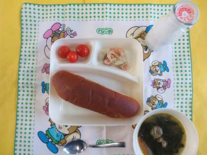 さけのマリネ、肉だんごと麦のスープ、プチトマト、黒糖パン、牛乳