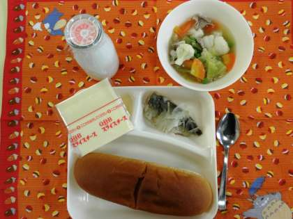 あじのレモンマリネ、スープ煮、スライスチーズ、黒糖パン、牛乳
