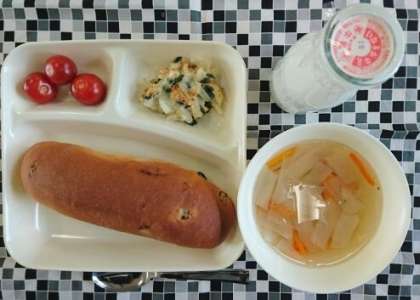 ほたて貝にグラタン、だいこんのスープ、プチトマト、レーズンパン、牛乳