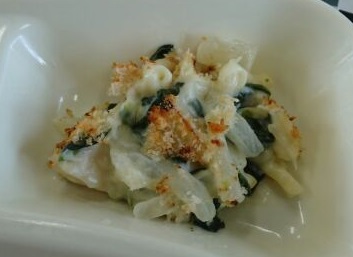 ほたて貝を主材に、マカロニ、たまねぎ、ほうれん草の入ったホワイトグラタンです。