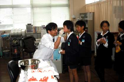 歯科衛生士さんの指導で、歯磨きの仕方などを教わり、その後、保健室で「フッ化物塗布」を行いました。