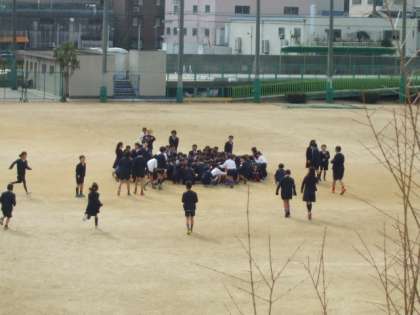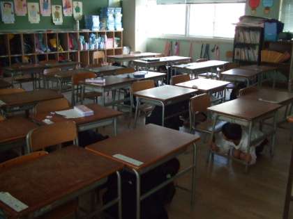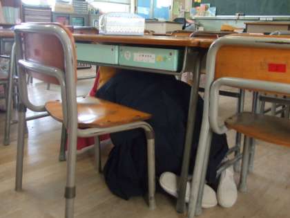 休み時間中、廊下や階段、運動場で地震が発生したとき、校舎内にいる児童は、机などの頭を守れる場所に入ります。運動場にいる児童は、運動場の真ん中へ行ってしゃがみこんで頭を守ります。そして、ゆれがおさまってから避難を開始します。