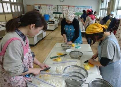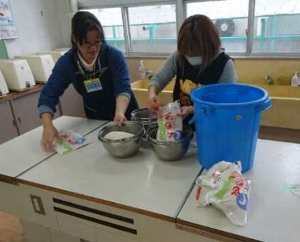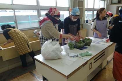 1月22日(日)に、PTAふれあいもちつき大会を実施します。今日、家庭科室で、PTA保護者の方々が、餅つき大会の準備をしました。たくさんの量のもち米を洗いました。雑煮の食材を準備しました。当日が楽しみです。