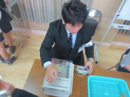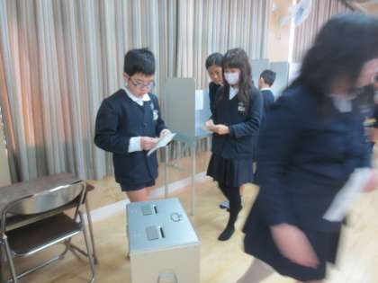 学校の休み時間を増やす考えの人・・・給食におやつを増やす考えの人・・・などの選挙公約を説明されて、どの人が選ばれればよいのかを考えて投票をしています。