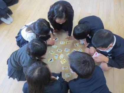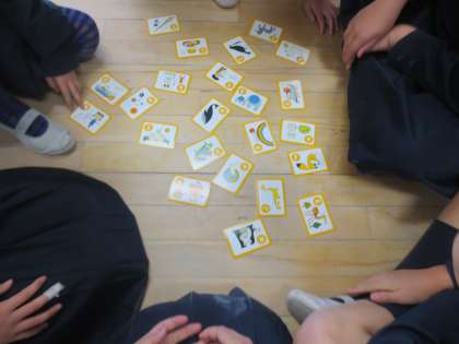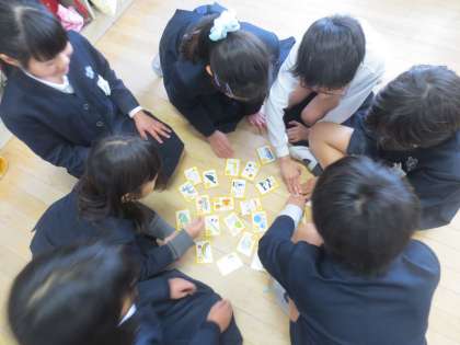 読みふだ担当の子どもが一斉に読み、各グループでかるた取りをしています。ワイワイ・・・ガヤガヤ・・・楽しい声がいっぱい出ていました。