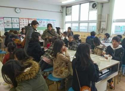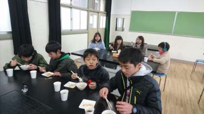 1年3年5年は家庭科室で、2年4年6年は理科室で食べました。自分たちでついたおもち,つきたてのおもちはおいしかった。