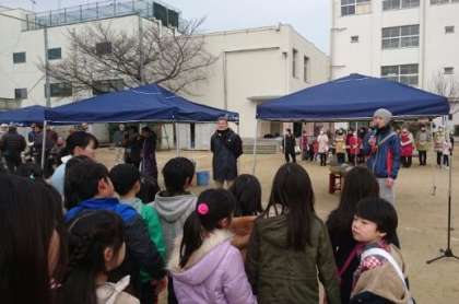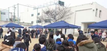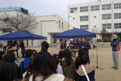 1月22日(日)に、巽南小学校の運動場で、「ふれあいもちつき大会」が行われました。地域の方とPTA保護者の方が、朝の7時から準備をしていただきました。