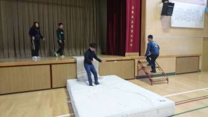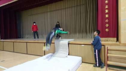 若手教員が中心になって、授業力アップに向けて互いに学び合うTM研修会を実施しました。今日は、前田先生を講師にして、体育科の「跳び箱」の指導の研修会をしました。跳び箱にマットをかぶせて、跳び箱の並べ方を工夫しました。セフティマットと舞台を使って場の工夫もしました。6年生のはねとびにチャレンジしました。