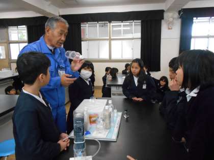 2名の指導者が大阪市水道局より来ていただきました。3・4時間目に2組が学習をし、5・6時間目に1組が学習をしました。実験などがあるので、理科室で学習をしています。