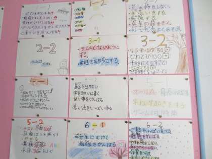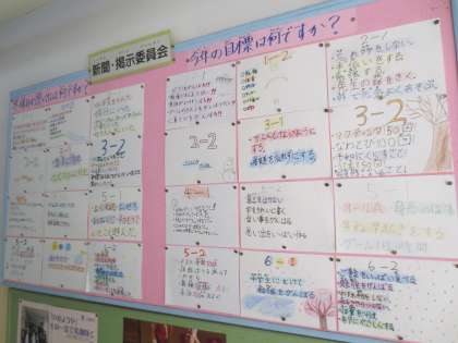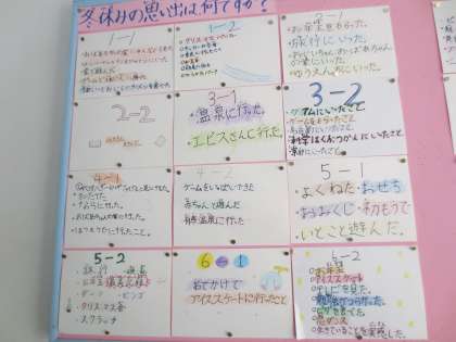 冬休みの思いでは何ですか? 今年の目標は何ですか? 新聞・掲示委員会の児童が取材をしました。後日、各学級ごとにまとめたものが掲示されています。