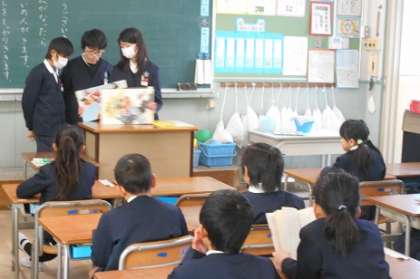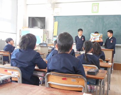 図書委員会では、学期に1回、低学年に紙芝居の読み聞かせをしています。委員会活動では、読み聞かせの紙芝居を選び、うまく読み聞かせができるように何度も練習をしました。朝の会に図書委員が、1年生に読み聞かせをしている様子です。