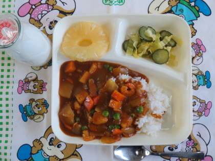 シーフードカレーライス、グリーンサラダ、パインアップル(缶)、牛乳