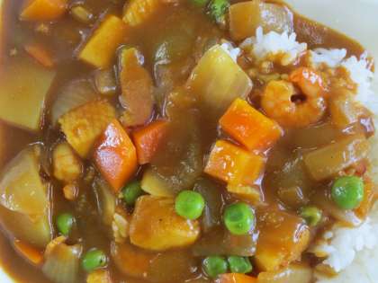 いか、えびを主材にしたカレーライスです。ベーコンやセロリーで風味を増しています。