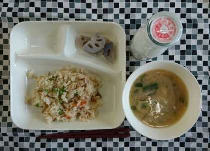 鶏ごぼうご飯、みそ汁、焼きれんこん、牛乳