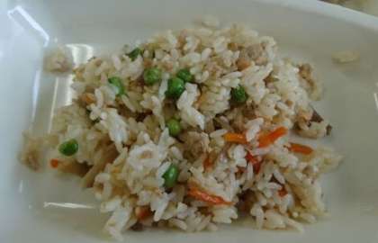 鶏挽肉、こんにゃく、ごぼう、にんじん、グリンピースを甘辛く味付けし、炊き上がったご飯に混ぜます。