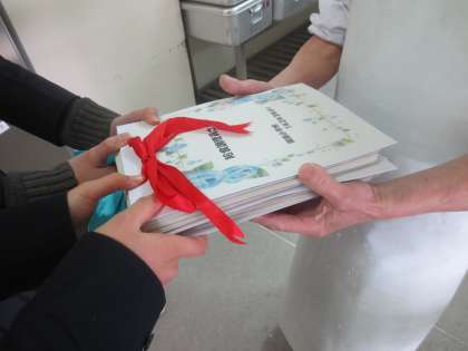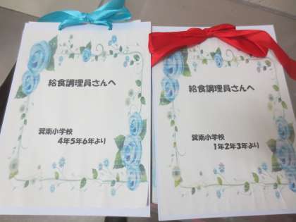 学校で毎日食べている美味しい給食のことや、給食調理員さんへの感謝のメッセージを、全校の児童一人一人が書きました。今日は給食委員会の委員長・副委員長が代表で、全員のメッセージを手渡しました。