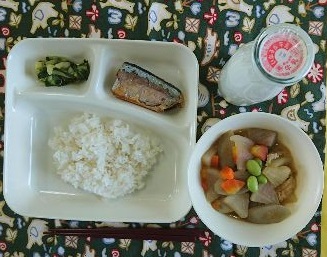さんまの塩焼き、鶏肉と野菜の煮もの、おおさかしろなのおひたし、ご飯、牛乳