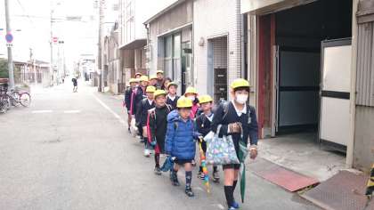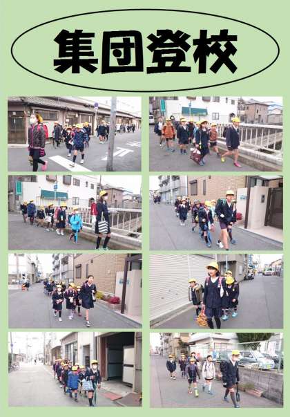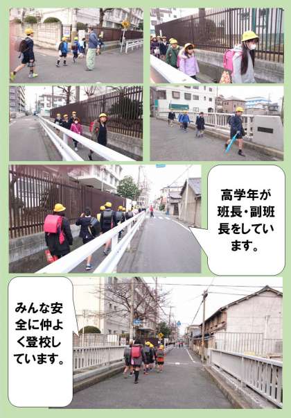 高学年の児童が班長・副班長をしています。毎朝、集合場所に集まり整列してから、安全に仲よく登校しています。班長さん、副班長さんはいつも安全に気をつかい、一生懸命に集団登校をしています。ありがとう。
