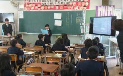 2月15日(水)、3年2組は、国語「詩に親しみ、詩を作ろう。気持ちを言葉に」の授業を参観していただきました。大型液晶テレビを使って、詩の発表の交流をしました。班で交流後、クラス全体で、友だちの詩の工夫していたところを伝え合いました。