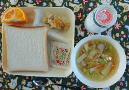 押し麦のグラタン、スープ、デコポン、食パン、りんごジャム、牛乳
