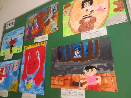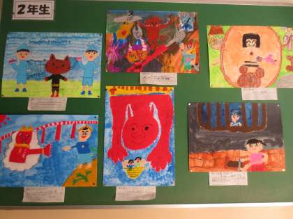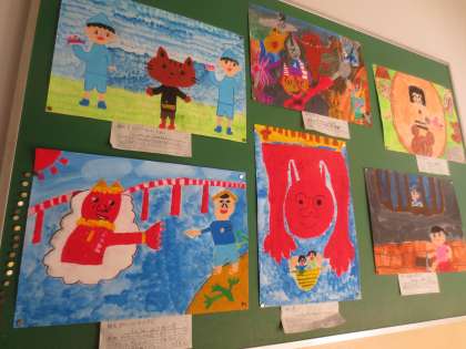 「きんたろう」「ももたろう」「だいくとおにろく」「しまひきおに」「三まいのおふだ」「ながぐつをはいたねこ」などのお話の絵が掲示されていました。一枚の絵に物語の内容がしっかり描かれています。