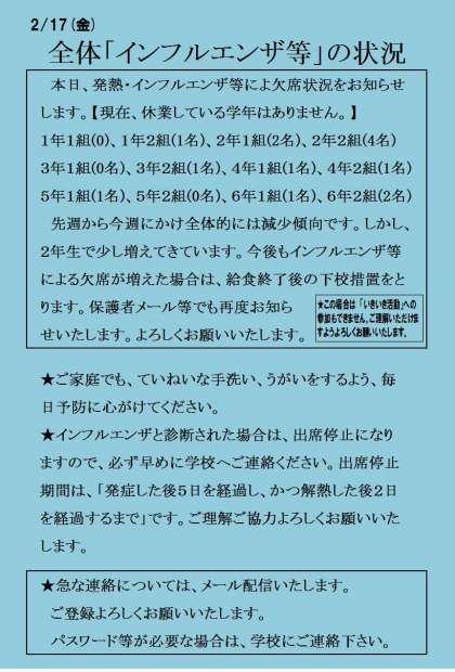 本日、発熱・インフルエンザ等による欠席状況をお知らせします。【現在、休業している学年はありません】学級ごとの欠席状況は、1年1組(0名)、1年2組(1名)、2年1組(2名)、2年2組(4名)、3年1組(0名)、3年2組(1名)、4年1組(1名)、4年2組(1名)、5年1組(1名)、5年2組(0名)、6年1組(1名)、6年2組(2名)です。先週から今週にかけ全体的には減少傾向です。しかし、2年生で少し増えてきています。今後もインフルエンザ等による欠席が増えた場合は、給食終了後の下校措置をとります。このような場合は「いきいき活動」への参加もできません。ご理解のほどよろしくお願いいたします。