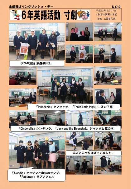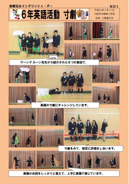 2/17(金)6年生が英語劇の発表会(前半)をしました。3週間前にヴーング カーン先生から6つの童話が紹介され、その中から自分たちで選び、自分たちで英語劇を練習して発表できるようにしました。6年生の児童はチャレンジしまし、みごとにやり遂げていました。英語劇の発表会の後半は、来週の金曜日にいたします。