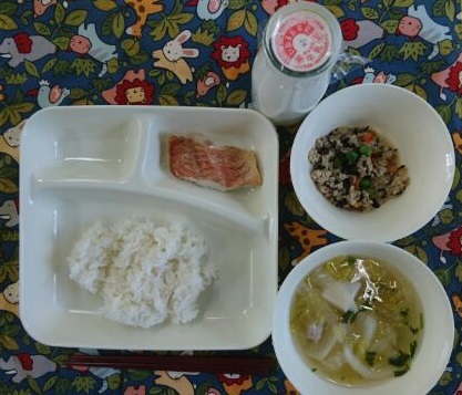 赤魚のレモンしょうゆかけ、うすくず汁、高野どうふのいり煮、ご飯、牛乳