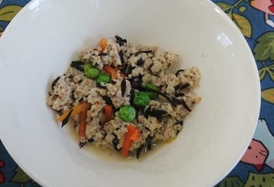 粉末の高野どうふとにんじん、グリンピース、ひじきの入った煮ものです。ご飯に合う一品です。