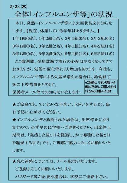 本日、発熱・インフルエンザ等による欠席状況をお知らせします。【現在、休業している学年はありません】学級ごとの欠席状況は、1年1組(0名)、1年2組(1名)、2年1組(0名)、2年2組(0名)、3年1組(0名)、3年2組(2名)、4年1組(1名)、4年2組(1名)、5年1組(0名)、5年2組(0名)、6年1組(1名)、6年2組(1名)です。ここ数週間、発症数減で流行の心配は少なくなってきておりますが、気候の変化等により増加もあります。今後も、 インフルエンザ等による欠席が増えた場合は、給食終了後の下校措置をとります。このような場合は「いきいき活動」への参加もできません。ご理解のほどよろしくお願いいたします。