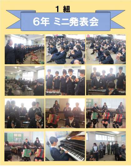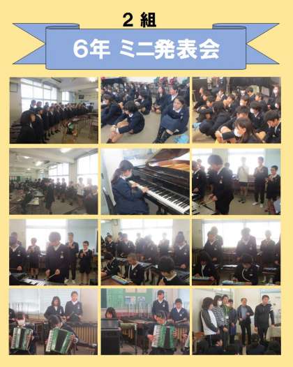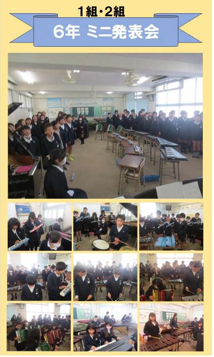 2/21(火)梅崎先生の指導で、6年生が音楽ミニ発表会をしました。とても素晴らしい歌声と合奏を披露してくれました。最初は学級ごとに発表しました。発表会をご覧いただいた先生方の感想では、力を合せて美しい音色で演奏した器楽合奏をほめていただきました。最後に6年生全員で合唱・合奏を発表しました。