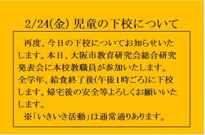 再度、今日の下校についてお知らせいたします。本日、大阪市教育研究会総合研究発表会に本校教職員が参加いたします。全学年、給食終了後(午後1時ごろ)に下校します。帰宅後の安全等よろしくお願いいたします。