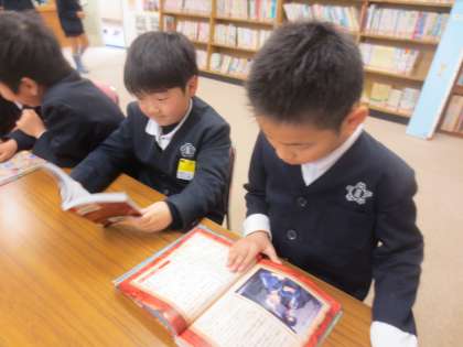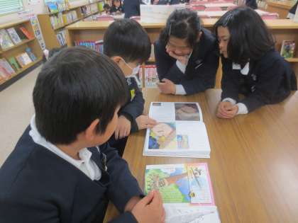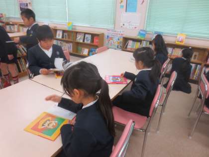 図書の貸出・返却をパソコンに入力していただいたり、さがしている本を見つけていただいたり、新しい本の紹介していただいたりしています。たくさんの子どもたちが来ています。